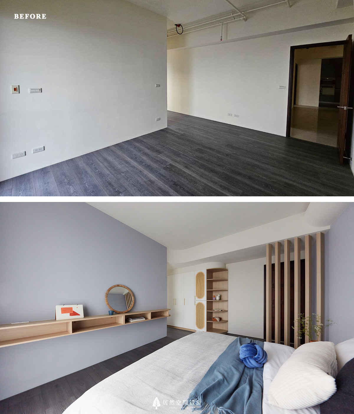 主臥以薰衣草紫為基調,鋪陳出舒緩靜謐的溫馨氛圍,在柔光渲染下的色彩氣息,如晚霞微染般安定心緒。床頭一側的格柵可避免一打開門直接對視床舖,提供更安穩的睡眠環境。