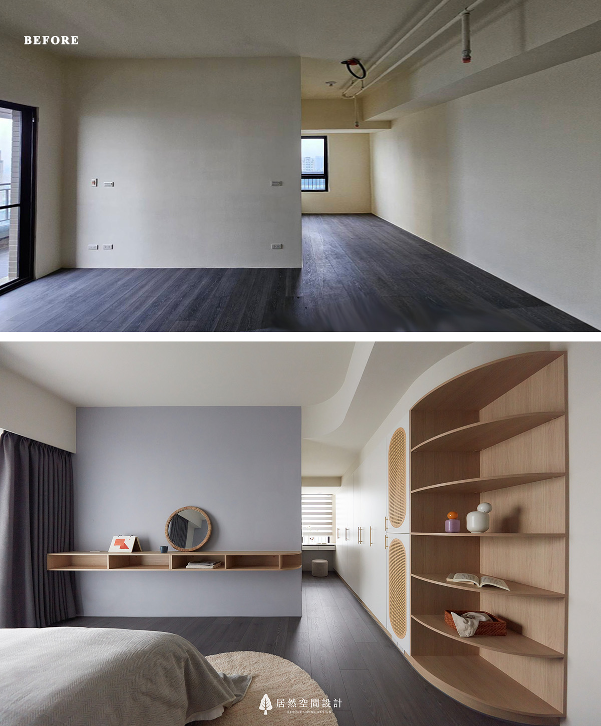 臥室的天花與樑以柔弧修飾,化解了壓迫感,營造出溫和流暢的空間感受,盡頭保留自然採光,特別規劃一隅梳妝台,成為女主人獨享清晨儀式的私密角落。