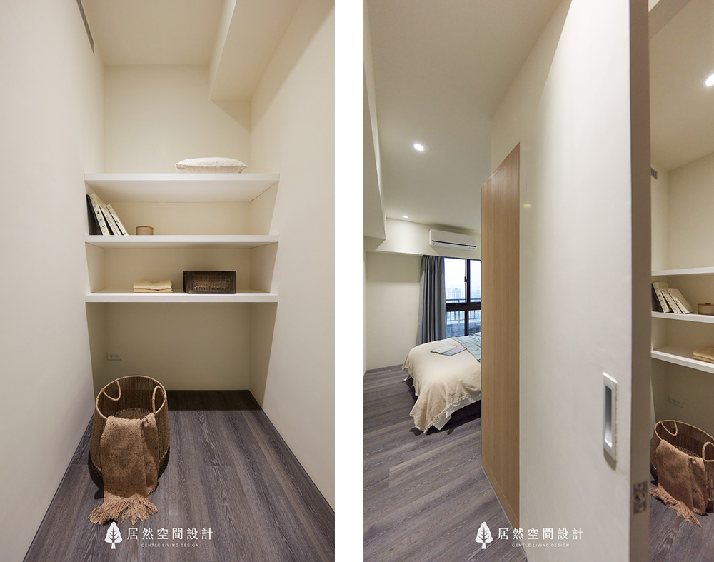 同時在房內隱藏一間倉儲室,取代厚重櫃體,供儲放較大型物件,像是露營用品、運動器材以及掃具等,以貼近生活實際面去做規畫,完善機能也維持整體視覺清爽。