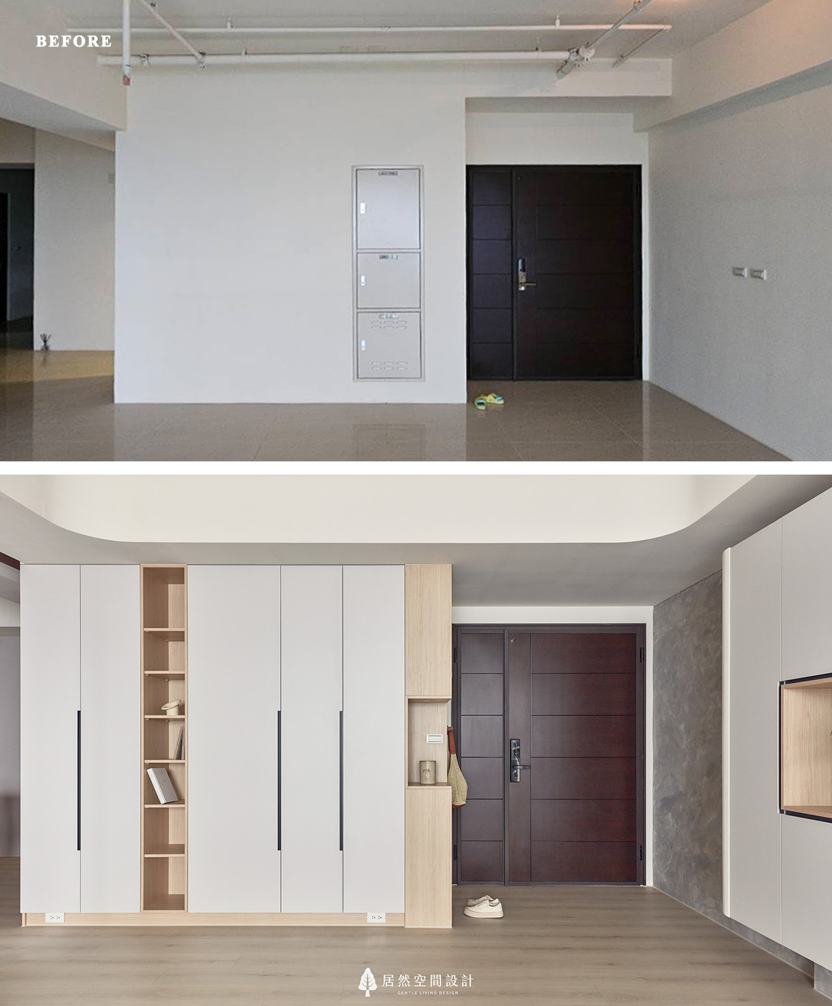 因應屋主一家收藏逾六十雙鞋履的需求,巧妙運用玄關延伸至餐廳之間的牆面,規劃充足收納,同時維持視覺的清爽與空間感。